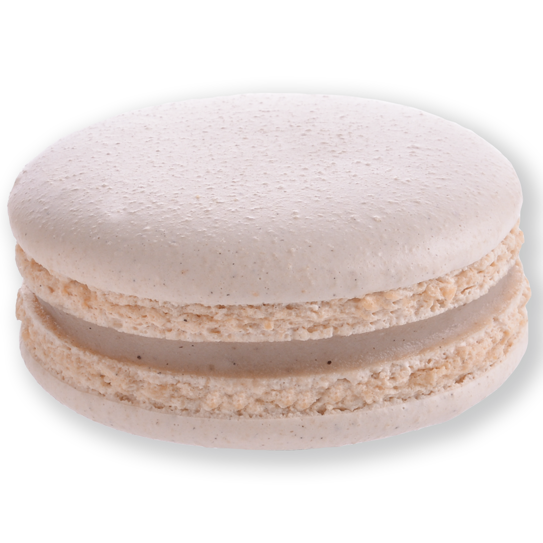 Ingrédients : fourrage 39% : eau, graisse végétale biologique (huile de coprah, huile de tournesol), sucre, dextrose, sirop de glucose (sirop de glucose, conservateur (bisulfite de sodium)), amidon, fécule de pomme de terre, gélifiant (pectine, saccharose), gousse de vanille < 0.1%, acide citrique. Coque macaron 61% : sucre, poudre d’AMANDE, eau, protéine de pomme de terre (protéine de pomme de terre, conservateur (bisulfite de sodium)), gousse de vanille, stabilisant : gomme xanthane.